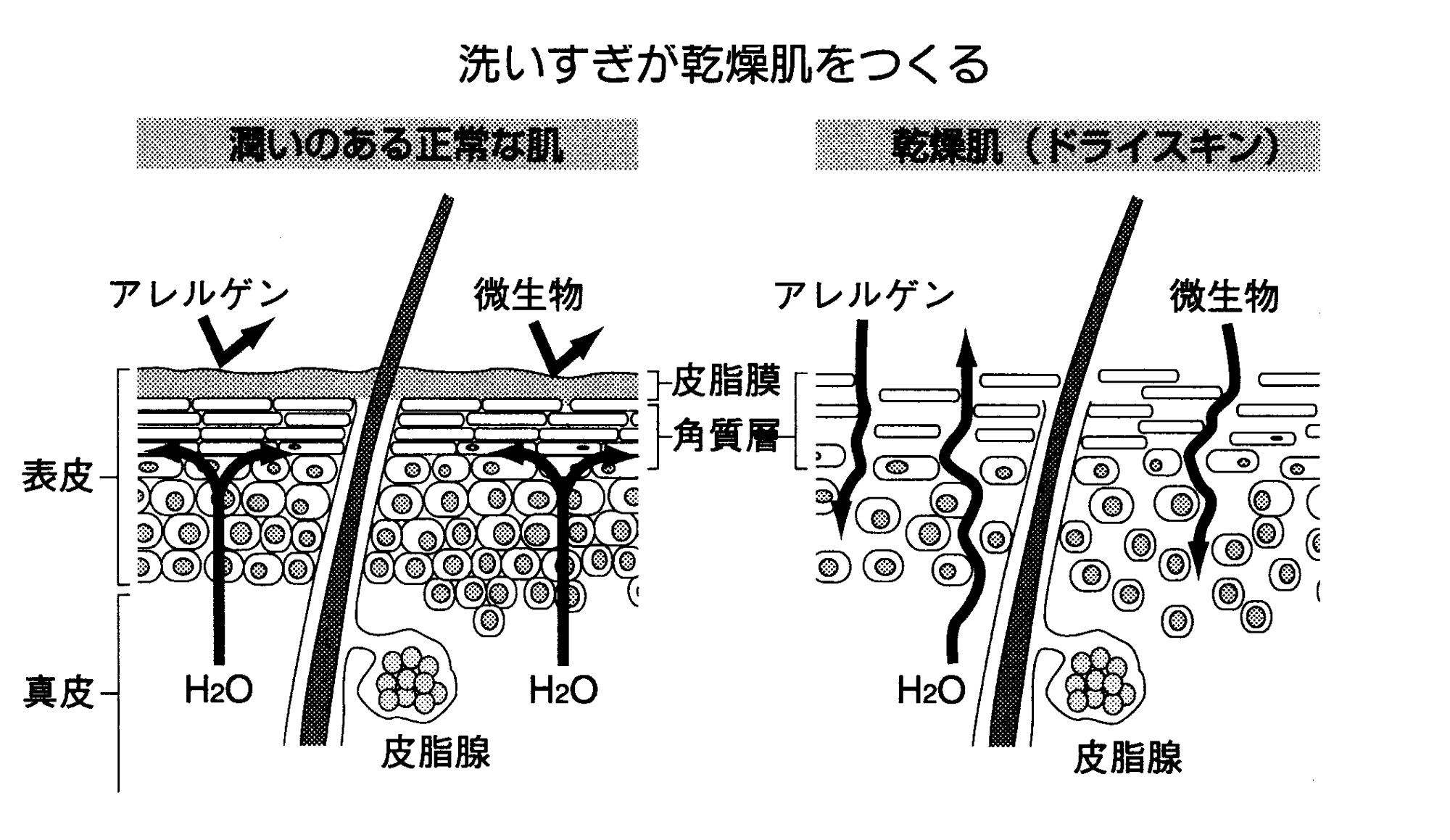 しかし、洗いすぎによって皮脂膜がはがれると、角質層にすき間が生じ、皮膚を組織している細胞がばらばらになっていく。