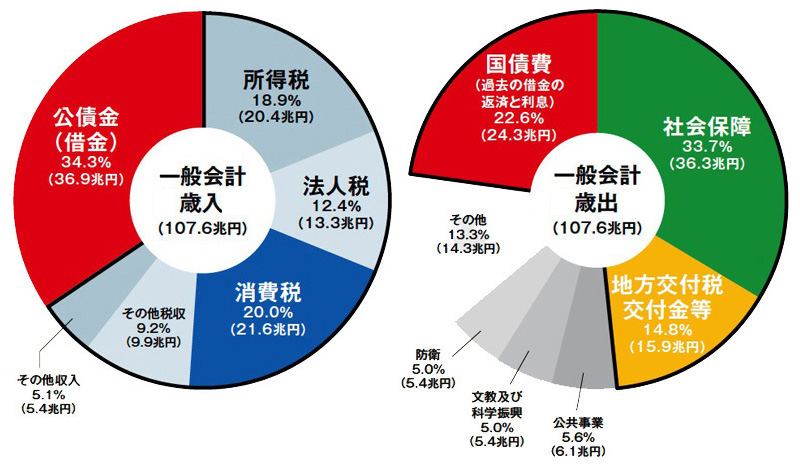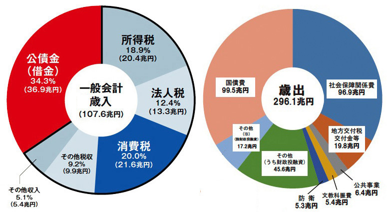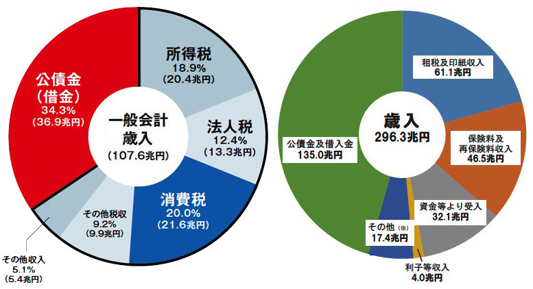 所得税 20.4兆円 + 法人税 13.3兆円 + 消費税 21.6