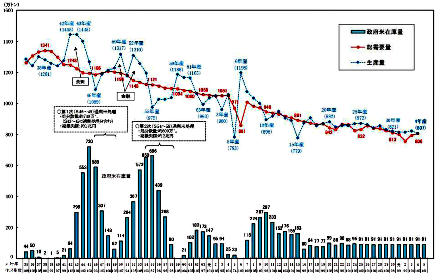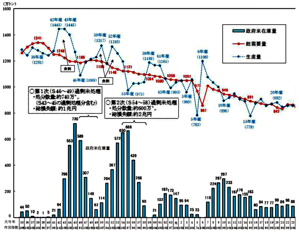 米配給制は,米余りになるとどうなるか? 米配給制は生産米全量買い取りなので,生産量から配給量を引いた分が,倉庫に貯蔵となる。 これは古米になる。 つぎの年も米は余り,生産量から配給量を引いた分が倉庫に貯蔵され,古米になる。 米は これは金を食う。 そして古米は,順次処分するしかない。 飼料等への転用が成っても,元値より安く売ることであるから,損失である。 ただ廃棄するのも,金がかかる。 こうして,余剰米の貯蔵・処分は,大きな財政負担になる。 そして米が余るほど,この財政負担は大きくなる。 財政負担は,これだけではない。 米配給制は,買い値と売り値が逆ザヤになってしまうものである。 この逆ザヤの分が,また大きな財政負担になる。 そして米が余るほど,この財政負担は大きくなる。 こうして米配給制は,米余りになるとたちまちほころび,崩壊する。 |