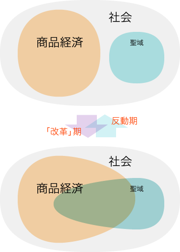 自分にはないものがそこにあるからだ。 <聖>を<俗>に取り込みことは,世界が<俗>だけになることを意味する。 <俗>は互いのつぶし合いを力学としている場である。 <俗>だけの世界は,この力学によって,自滅する。 ──<聖>は<俗>を生かすために設けられている。 <聖>は<俗>を生かすために設けられている。 しかしこのことが,わかられていない。 このメカニズムが微妙・複雑で,難解だからだ。 ひとは,<聖>を壊しその報いを受けてはじめて,<聖>の理由を知る。 そして,<聖>の再建に取り組む。 <聖>が出来上がった後にやって来る世代,すなわち<聖>が所与になっている世代には,<聖>の理由がわからない。 彼らは再び<聖>の破壊を行う。 以下繰り返し。 ![]() |