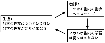 既に述べたように,「できる」指向の学習は早晩破綻します。そこで再び,生徒の学習困難が顕在化します。そこで教師はさらに「できる」指向の授業に向かう‥‥