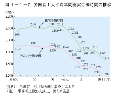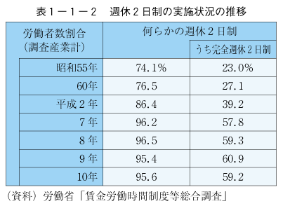 労働省の調査によれば,平成10年における完全週休2日制は労働者割合で59.2%(平成2年39.2%),隔週など何らかの形で週休2日制を導入している比率は95.6%となっており,週休2日制の進展が見られます( 表1-1-2)。労働者1人当たりの総実労働時間,所定内労働時間(ともに事業所規模30人以上,調査産業計)は,いずれも昭和63年以降減少傾向となっており,11年にはそれぞれ1,842時間,1,709時間となっています( 図1-1-7)。こうした自由時間の増大や高齢化など,我が国社会の成熟に伴い,心の豊かさや生きがいを求める傾向は,生涯学習に対する需要の拡大という形をとって現れます。また,情報化,国際化,産業構造の変化などに伴い,社会人は絶えず新しい知識や技術の習得を迫られ,これも生涯学習に対する需要となっています。