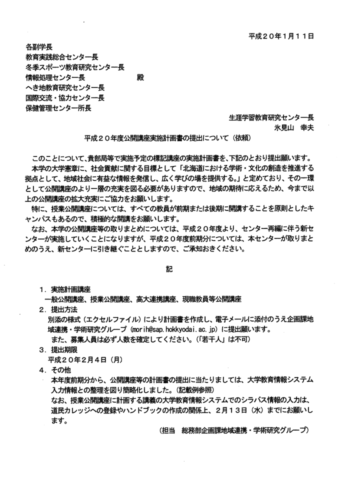 札幌校は,公開講座の義務化および授業公開の原則化を定めている分校である。 センターからの公開講座・授業公開実施指示は,長がリレーして教員に伝える。 そして,このときの通知文において,改めて「義務」が強調される: