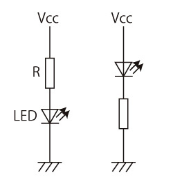 ![]() 水源を考えよう。 水中の各点には,水圧がかかっている: ![]() 水源の側壁から管を刺し通す。 管の中を水が流れる。 ![]() 流れの強さは,「流れに垂直な面を単位時間に流れる水量」と表現される。 これを定めるものは,管を差し込む場所と管の様態である。 管を差し込む場所の含意は,水圧である。 同じ水圧での「流れが強い・弱い」の違いを,「管の抵抗が小さい・大きい」と読む。 水流は,水圧と管の抵抗で定まる。 ここに出てきた「水源・水圧・導管(抵抗)・水流」が,「電源・電圧・抵抗・電流」のアナロジーになる。 そこで LED と R の回路図に話を戻そう。 疑問は,「LED は R の後?それとも前?」であった。 この疑問は,つぎの回路 (R回路) の意味がそもそもわかっていないことに因る: ![]() 水を流す「管」の意味は,「水流の規格を定めるもの」である。 電子回路の「抵抗」の意味は,「電流の規格を定めるもの」である。 無規格の電流というものはないから,「抵抗があって電流がある」と言える。 回路図には,パーツをつなぐ導線が書かれているが,これが誤解のもとになる。 つぎは,回路図ではない: ![]() ![]()