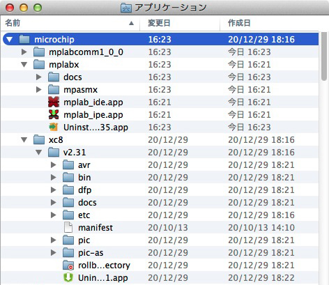 MPLAB X のディレクトリ:Applications/microchip