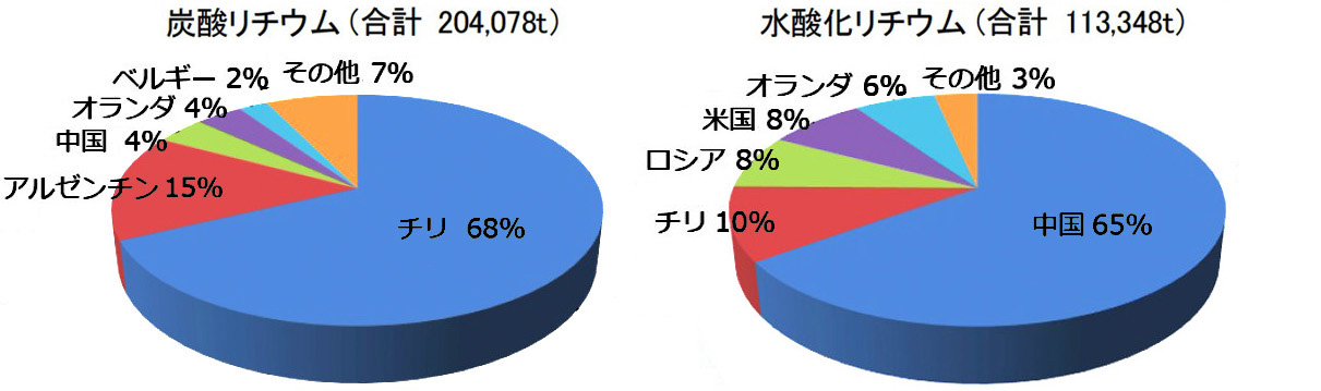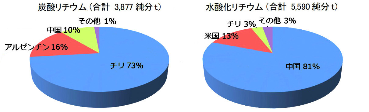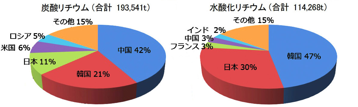 原料として、炭酸リチウムはLIBのニッケル系以外(コバルト系、マンガン系、三元系等)の正極材と電解質に使われ、水酸化リチウムはニッケル系、三元系正極材に使われており、それぞれの主要用途となっている。