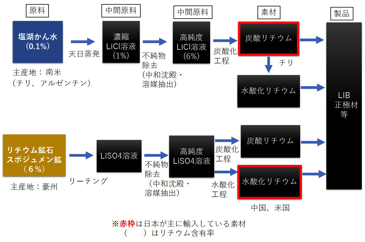 塩湖のかん水とスポジュメン(リチア輝石)鉱石を原料として、炭酸リチウムや水酸化リチウムなどのリチウム製品が作られる。