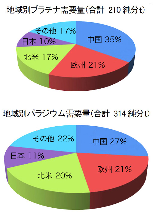 プラチナは、‥‥‥宝飾用や医療用としての用途の他に、自動車用排ガス触媒に必要不可欠な材料として広く利用されており、現在はディーゼル車用触媒に主に使用される。