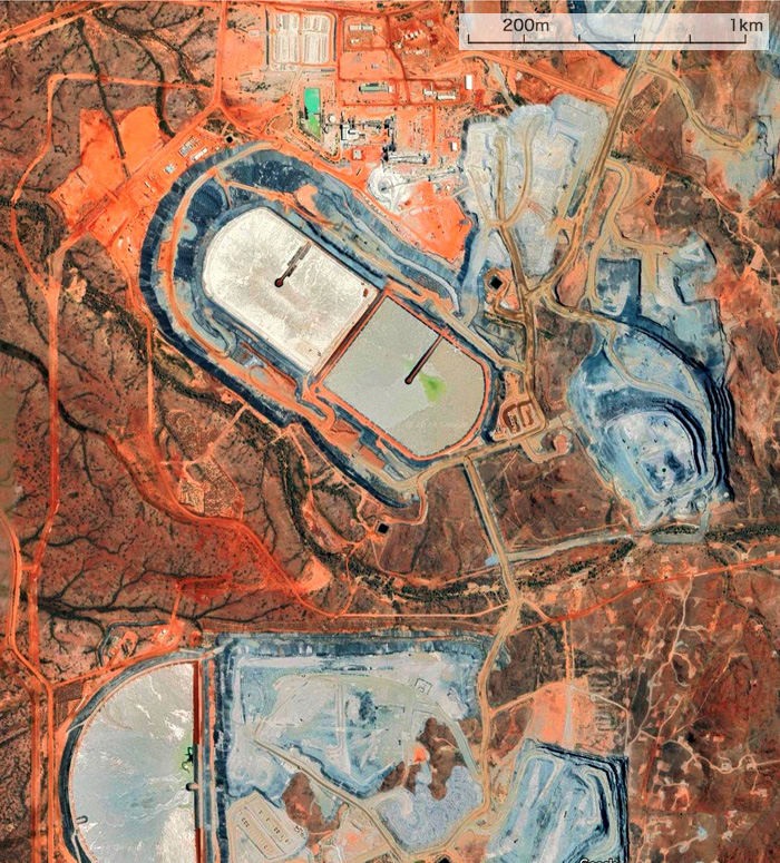 露天掘りとリチウム溶液池が明瞭に見える: