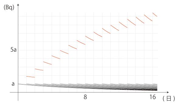 連続変化に対する蓄積量を求めるのは難しいので,ここでは,「1日1回,吸気・水・食事でヨウ素131をaベクレル摂取」のときの「ヨウ素131の蓄積」を求めてみる。 これでも計算になるとひどくたいへんだが,グラフの上の手作業 (一目盛りずつズレて現れる半減期グラフを足し合わせる) ならやれる。 つぎが,このグラフである (赤色の線が蓄積量のグラフ):