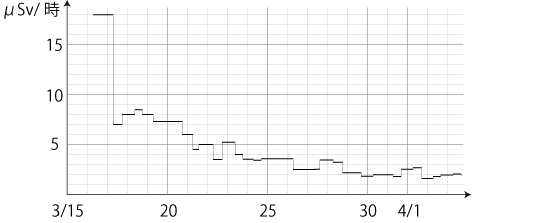 なお,これは観測している場所 (屋外) の被曝である。 個人の実際の被曝量は,「屋内」を<減少>の要因に,「吸気・水・食物による体内被曝」を<増加>の要因に,考え合わせるものになる。 |