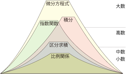 ところで,数学は体系的である。 比例関係,区分求積,指数関数,積分それぞれの学習は,それぞれの裾野になるものの学習の累積である。 そして,これらの裾野全体は,学校数学全体になる: