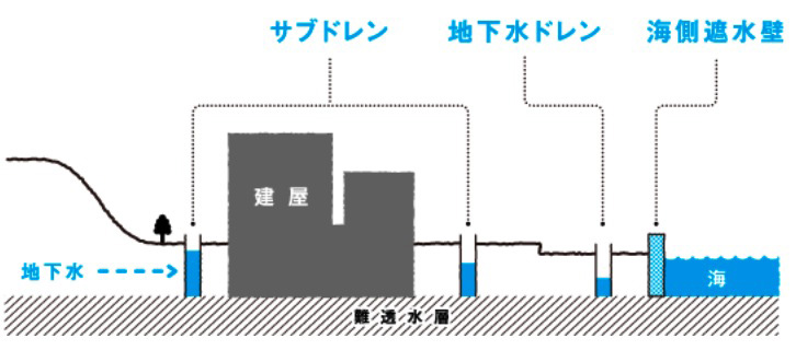 建屋屋根の破損部から雨水が流入することをふせぐため、補修工事を実施 モルタルなどで敷地を舗装することで、雨水が土に浸透して地下水になることを防ぐ 山側の高台に井戸(地下水バイパス)を設置 。建屋に近づく前に地下水をくみ上げる。くみ上げた地下水は東京電力と第三者機関で分析をおこない、放射性物質の濃度の基準(運用目標)を下回ることを確認して排出している 建屋近くに井戸(サブドレン)を設置。地下水をくみ上げることで、建屋周辺の地下水の量を減らして水位を低く抑え、建屋に流入する地下水の量を抑える。くみ上げた地下水は浄化処理し、地下水バイパスと同様に運用目標を下回ることを確認して排出している 建屋周辺を取り囲むように地中に配置した「凍結管」という管に冷却材を送り込むことで、周辺の地盤を凍結させて壁をつくる。これにより建屋内への地下水の流入量を抑える ALPS 等で汚染水に含まれる大部分の放射性核種を除去 高台の溶接タンクに ALPS処理水を保管 海に繋がる配管内の汚染水を処理 海側の地下水を汲み上げる井戸 海への流出を防ぐ鋼鉄製の壁 |