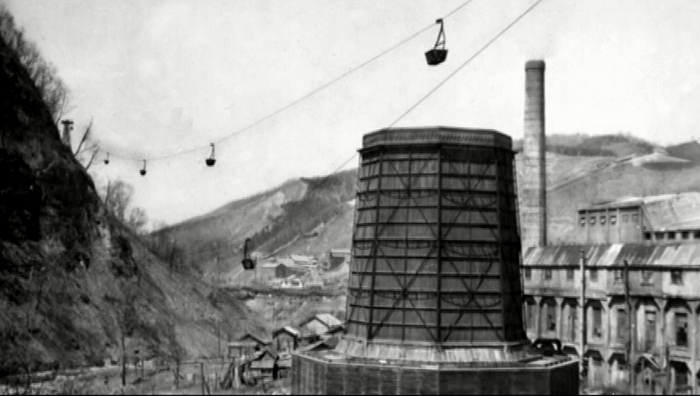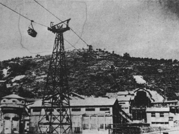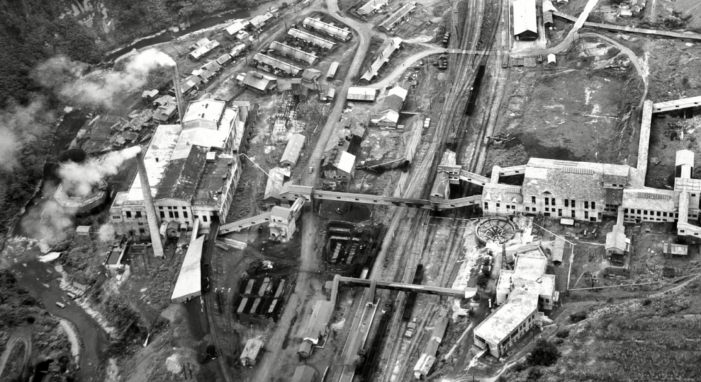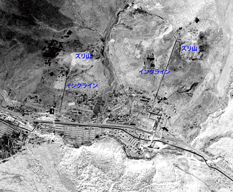坑口から選炭場へのインクラインが2本見える。
