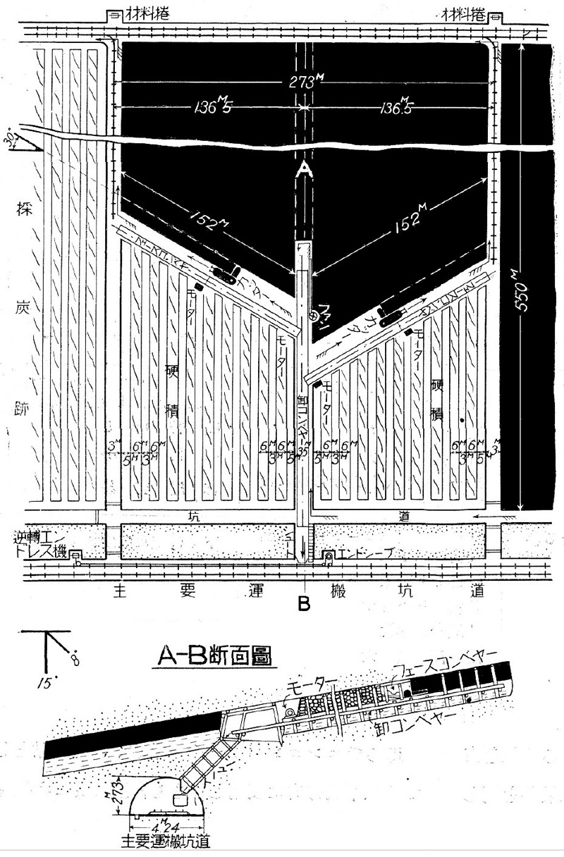 各切羽共に,カッターの透し跡には鉄板を敷込んで,石炭をショベルでコンペヤーに(はね)込み易くし又下磐の混入を防止する。‥‥‥