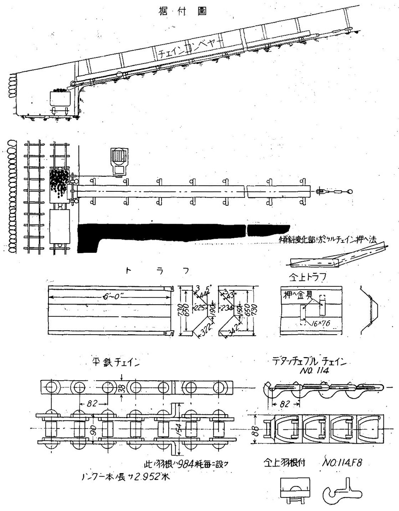 現今一般に使用せられつゝある切羽コンベヤーとしては,此以外に「シヱーカーコンベヤー」「ペルトコンペヤー」等ありて各特長あれ共,當礦に於てはチエンコンベヤー最も適當せるを以て、之れを選びたり。‥‥‥