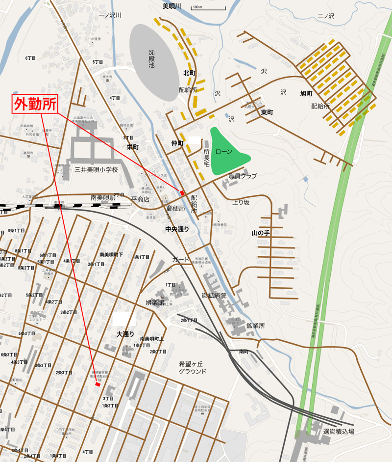 大きな自治体の役場は,住民サービスの窓口として支所を設ける。 これと同じことで,大きな炭鉱は,総務部が住民サービス窓口の派出所を設けることになる。 これが「詰所」である。 三井美唄炭鉱の場合は,労務課の派出所であり,「外勤(所)」と呼ばれた。 それは,職員用と鉱員用に,つぎの2箇所に置かれた。 |