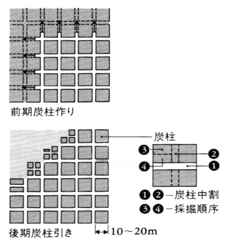 この方式は,日本では,現在のように採炭機械が発達しておらず,かつ比較的浅い炭層でガスが少なく,また地表陥没の問題がなかった時代には,簡便に採掘ができるので盛んに行われたが,漸次坑内が深くなるにつれて行きづまり,ほとんど長壁式採炭法に移行していった。