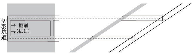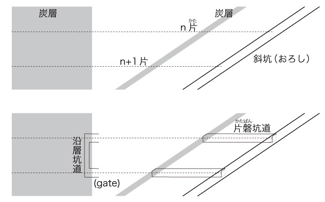 岩盤坑道 (斜坑ないし立坑) から炭層へ,水平坑道 (「片磐坑道」) を上下2本掘る。