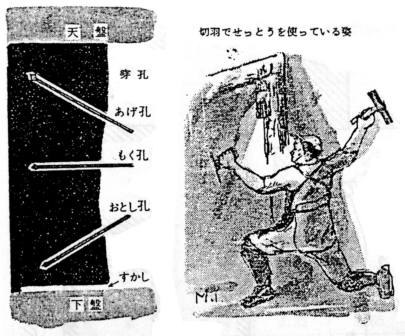 尺の鋼鉄製のたがねを炭壁に打ち込んで、深さ三尺程度の穴を幾つもあけ、つるはしで炭壁の下部に「すかし」を入れてから穴に火薬を詰め、これを爆発させて石炭を崩すので、この方法を「発破採炭」とも呼んだ。