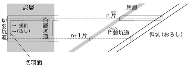 ここで「n 片」はレベルを表し,炭層を上から下へ1片,2片,‥‥‥と区切る。 そして,幅 [n片, n+1片] の炭層の掘削を終えたら,[n+1片, n+2片] に移る。 採炭はこのようにして,段々と深くなっていく。 やがて,採算の取れないところに至る。 これで,その坑は終わりである。 炭鉱を続けるには,新たに坑を見つけねばならない。 見つけられなかったら,お終いである。 上図の切羽面 (掘削面) は,長さ 100〜200m。 機械化されると,掘削機械がこの長さの面を横移動しながらバリバリ削っていく。 よって,機械化することは,坑を短命にするということである。 さらに,機械化することは,採炭を限定することである。 機械化すると,機械が働けるところを掘ることになる。 機械が働けないところは人力で対応するしかないが,ひとは昔には戻れない。 機械が働けないところは,放置されることになる。 そして機械化することは,炭鉱を経営できない体にすることである。 機械化すると,生産量が上がる。 生産増に需要が伴う限り,企業は成長する。 言い換えると,成長させられる。 景気は波であり,需要はつぎは冷え込む。 大きくなった体は,これに対応できない。 もとの小さい体に戻ることは叶わないわけである。