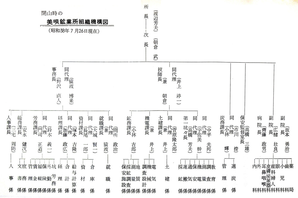 組合の団体交渉はヤマ元から中央に移り,交渉は難航したが,6月27日,トップ交渉によって会社の最終的な考え方を提示させ,28日,この結論を第3回闘争委員会が了解し,妥結することを確認し,昭和38 (1963) 年7月27日付けをもって三井美唄鉱業所は閉山することに決定,7月15日から操業中止,26日殉職者合同慰霊祭,27日閉山式を行ない,12月,長年親しまれてきた通洞坑口を密閉し,ここに三井美唄鉱35年の 歴史が閉じられたのである。