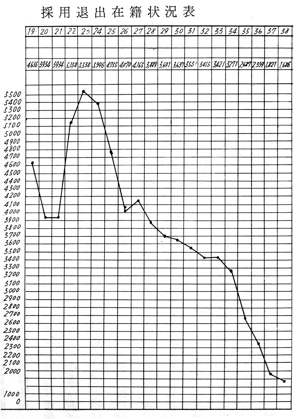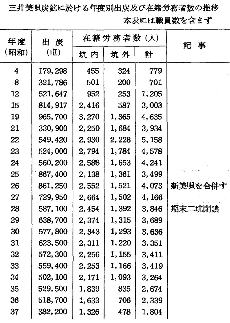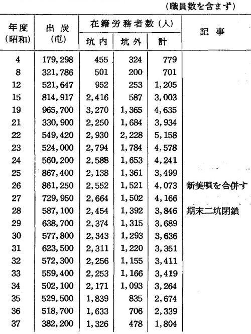開坑以来閉山前年度迄の出炭並に在籍労務者数の推移