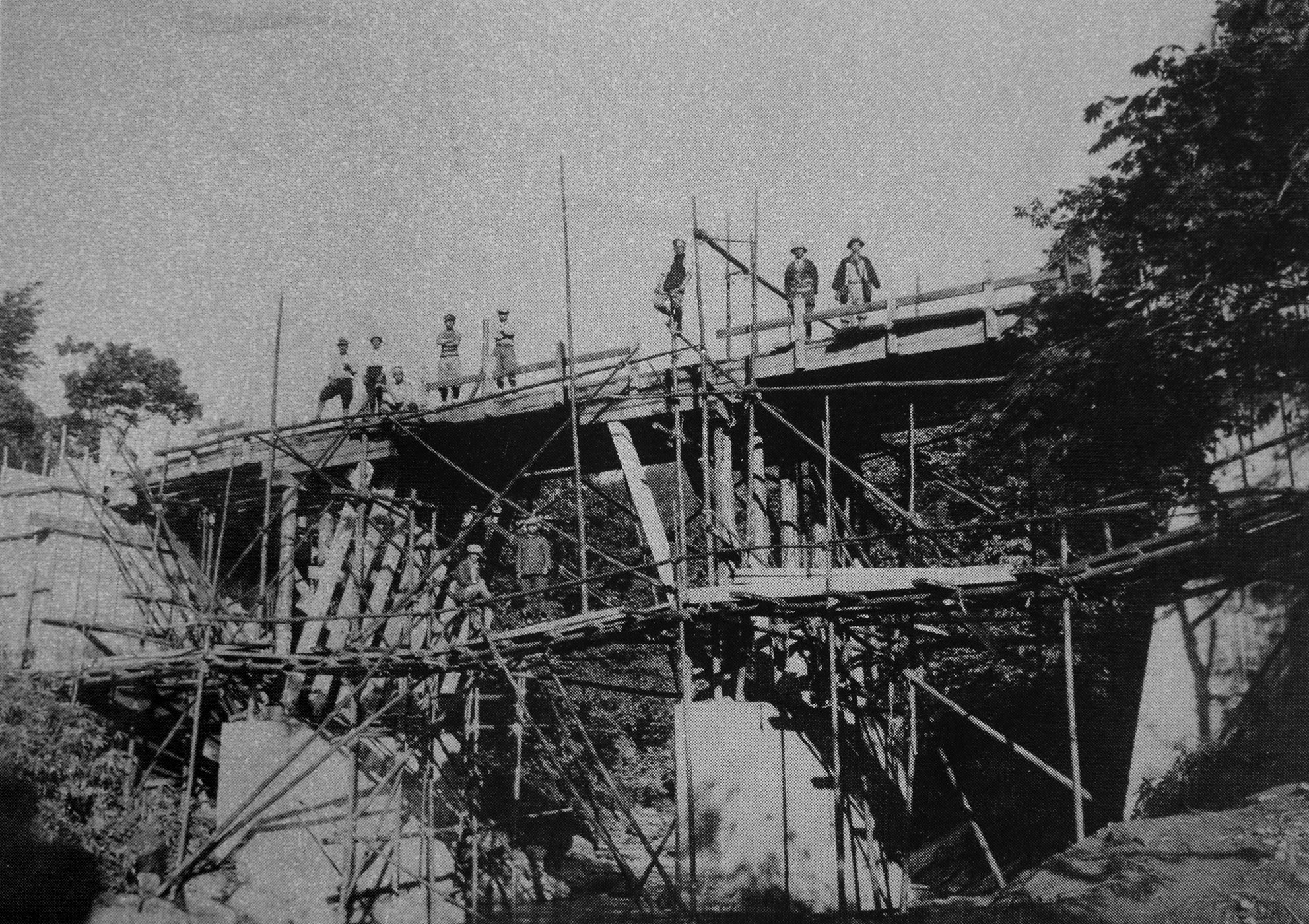 我路市街は櫻井農場の一部を造成した市街地で,美唄川が蛇行する彎曲部にあった。 上・下流部とも深く切れ込んだ渓谷で,下流部の橋はたびたび流され,大正末頃に本格的な改修工事が行われた。」