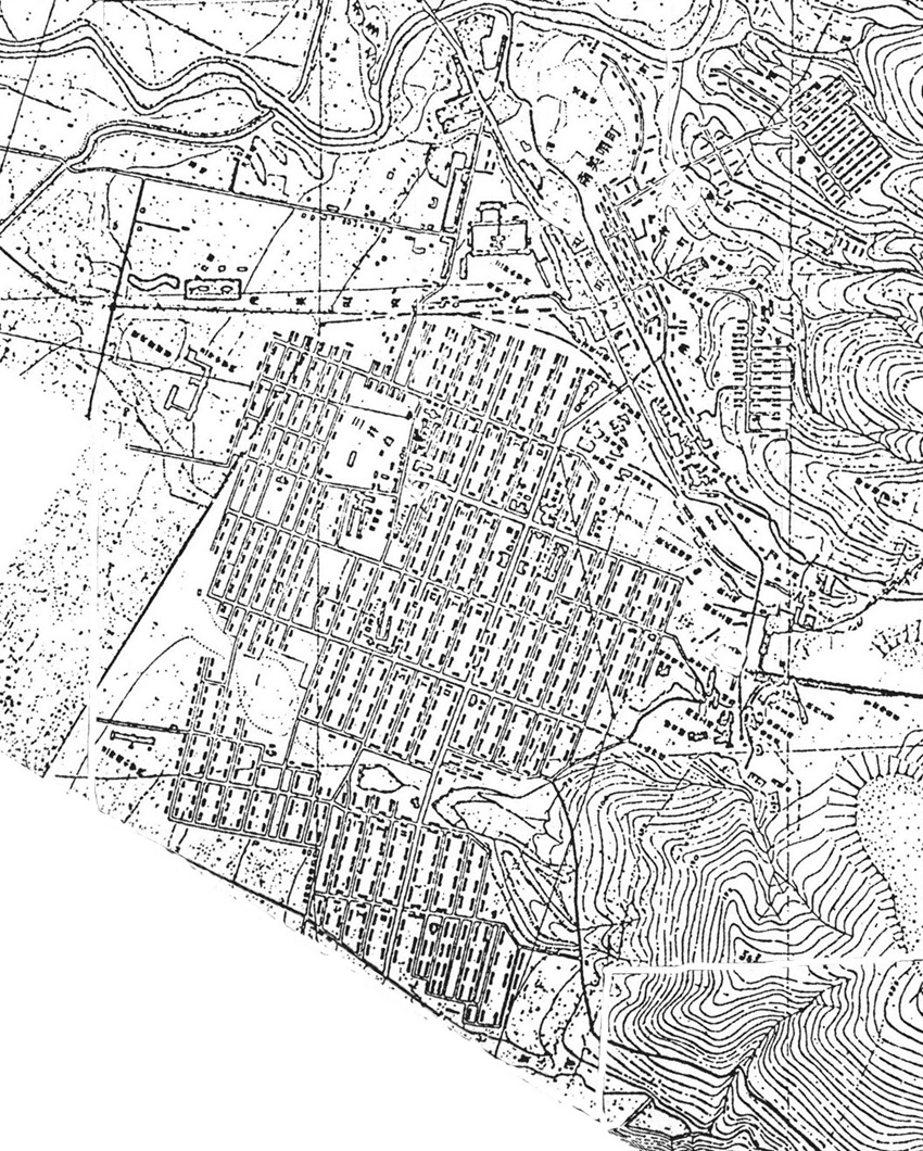黄色:鉱員住宅域,水色:職員住宅域,赤色:社外者営業域