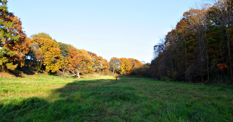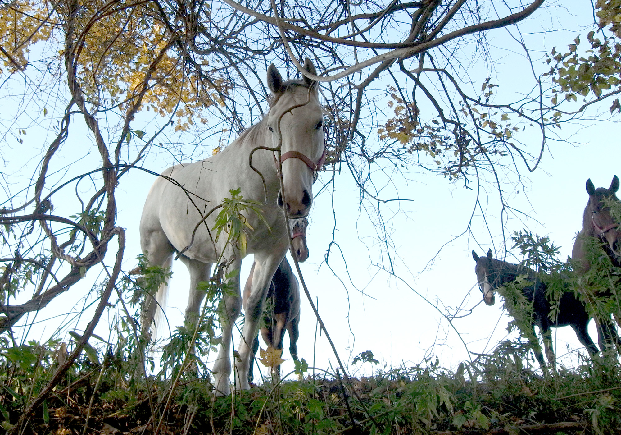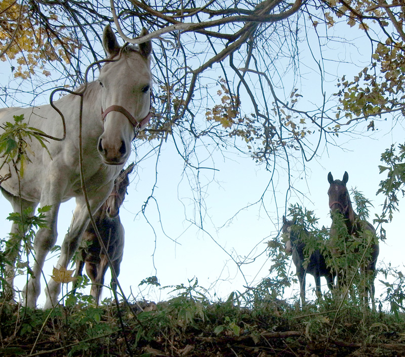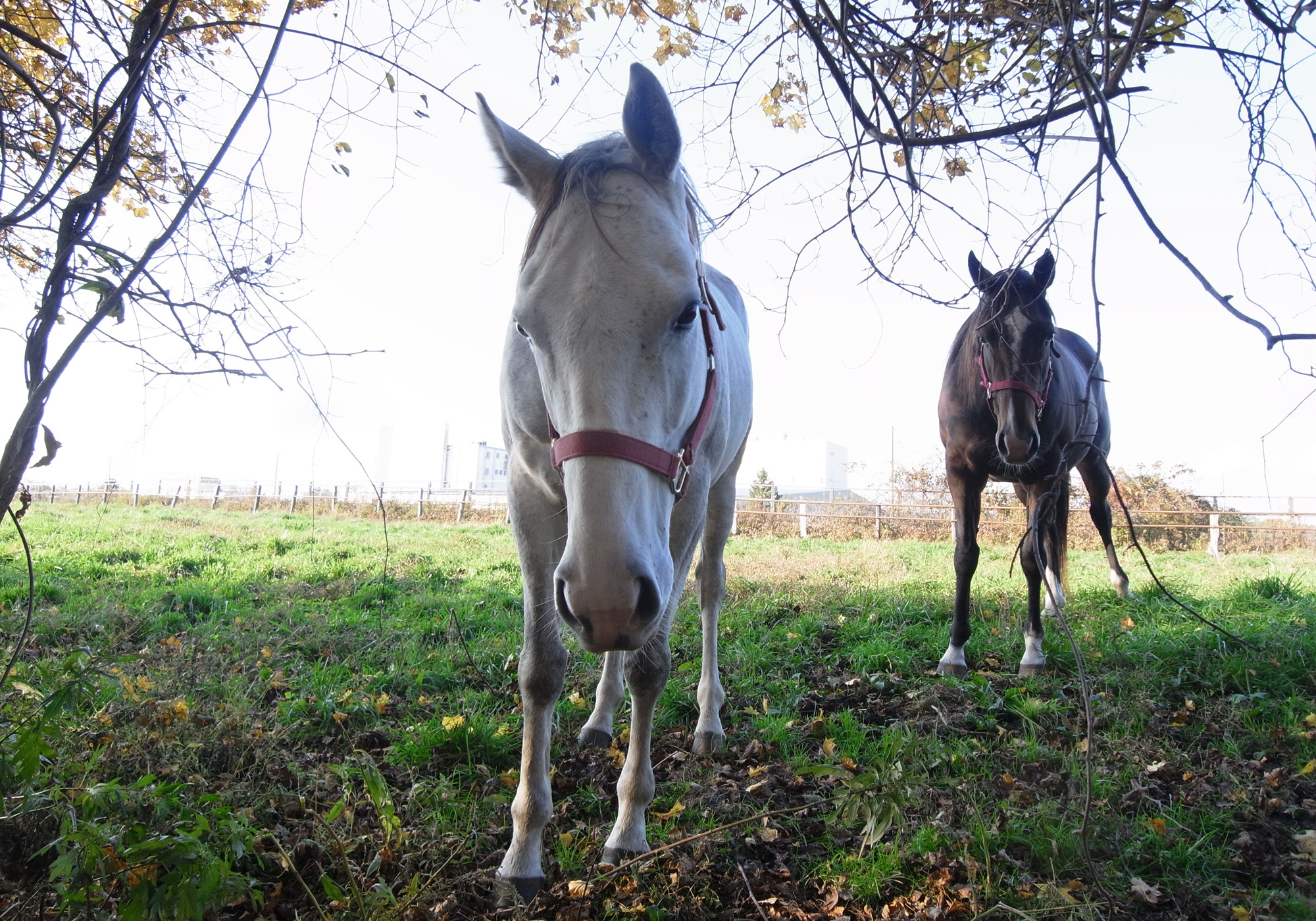 左斜面を上ると馬の放牧地があり,馬が寄って来た