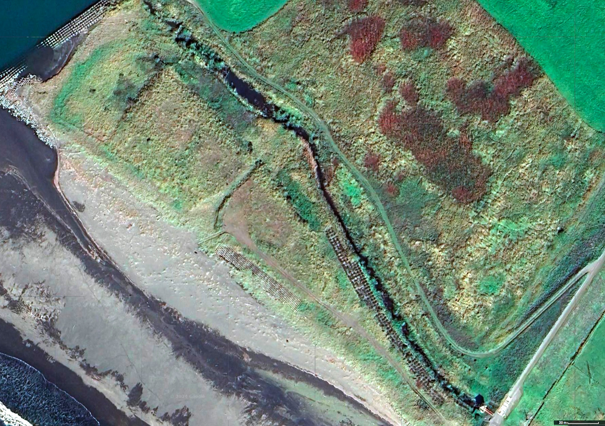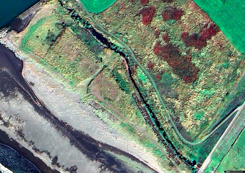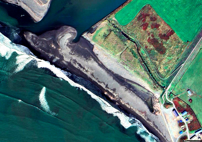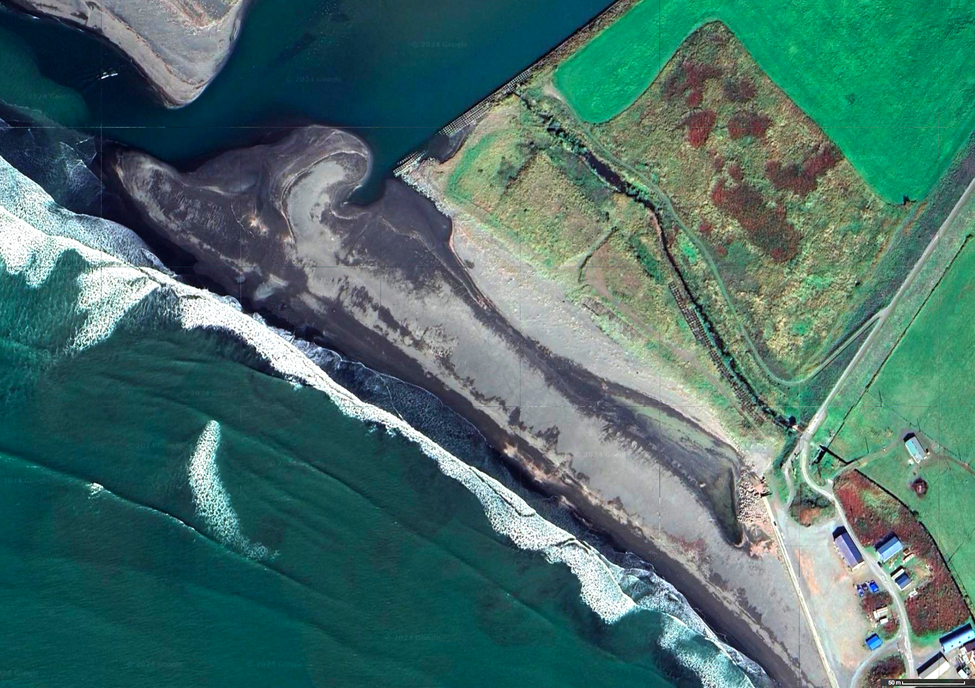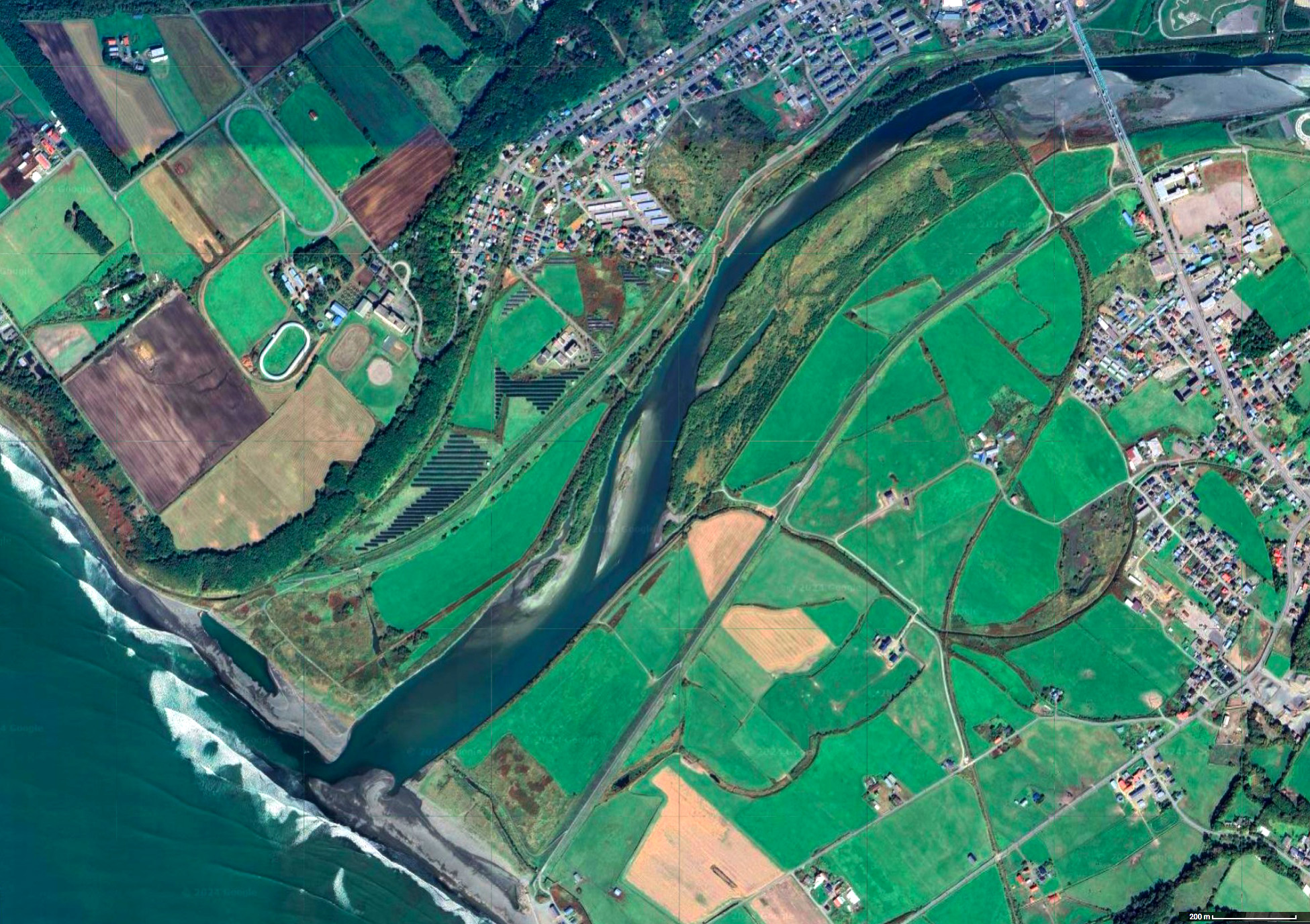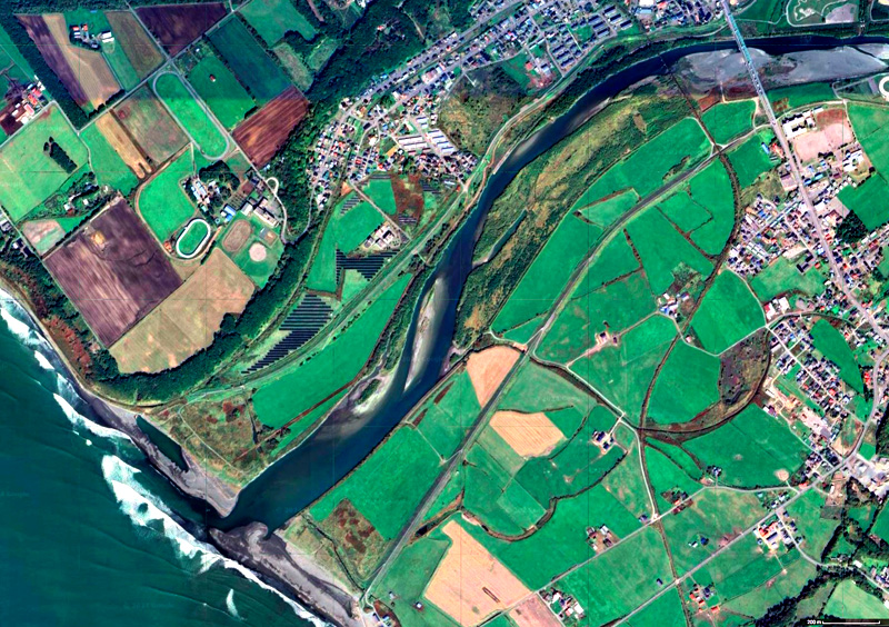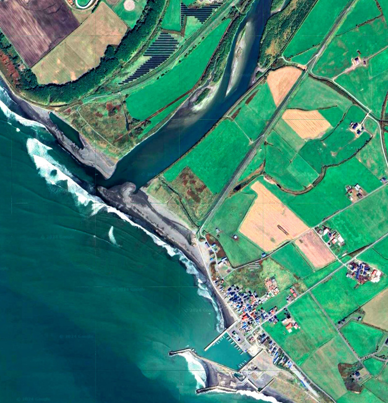 つぎは,Google Map で現在 (2024-05-25) 表示される沙流川河口域。