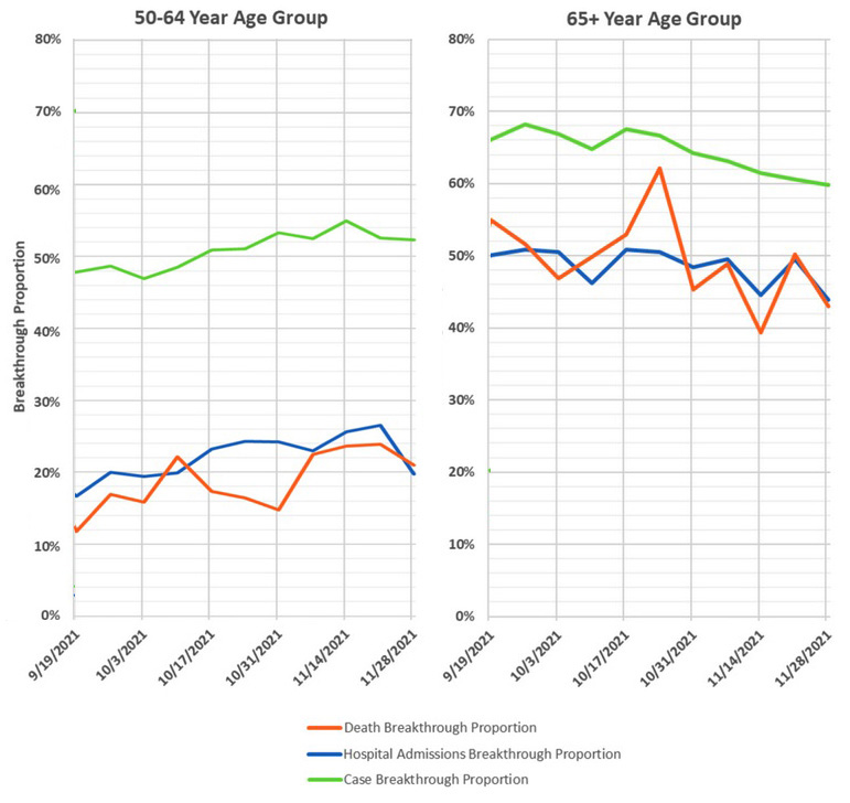 ブレークスルー感染は,50-64歳ではこの年齢グループの感染者の 50% 前後で,65歳以上だと 65% 前後。