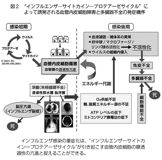 ウイルス感染でサイトカインが誘導され、次いでサイトカインでプロテアーゼが誘導され、プロテアーゼがウイルス増殖を促進するサイクルが回転して、血管内皮細胞の透過性の亢進から多臓器不全に発展する