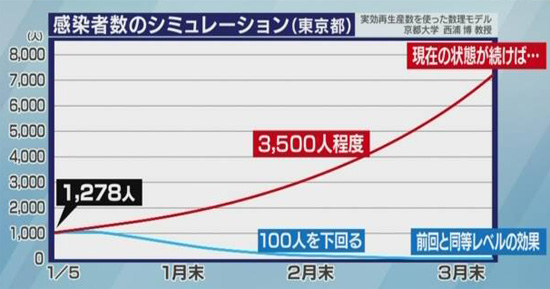 それによりますと現在の感染状況から、東京都の実効再生産数はおよそ1.1となり、仮に新たな対策をせずにこの状態が続くとすると2月末時点での新たな感染者数は1日およそ3500人、3月末にはおよそ7000人まで増えるとみられるということです。