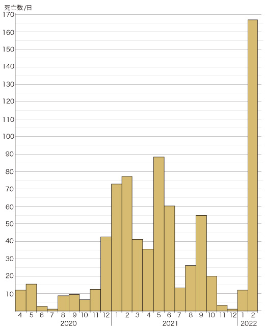 1日あたり死亡数の推移をヒストグラムに表すと: