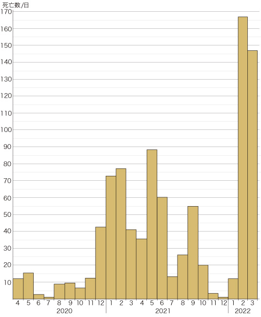 1日あたり死亡数の推移をヒストグラムに表すと: