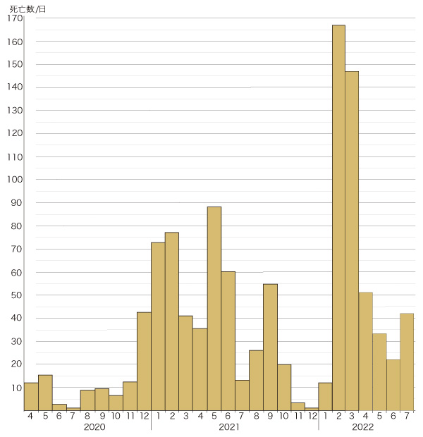Up 死亡数の推移 (累計と1日あたり) : 2022-07-31 まで 作成: 2022-08-02