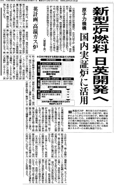 しかしひとは,<平均気温が上がる>は<CO2 排出によって地球が温暖化している>だと思う。 ひとは,そう思うように洗脳されてきた。 こうして「脱炭素」が,ひとの絶対善になる。 ひとは「脱炭素」のことばが付いていれば,何でも善にする。 そこで,EV は善である。 化石燃料車は,EV に替わらねばならない。 しかし EV を実現するには,いまの倍以上の電力量供給が必要になる。 そして原発は,CO2 を排出しない。 読売新聞曰わく: