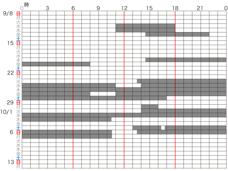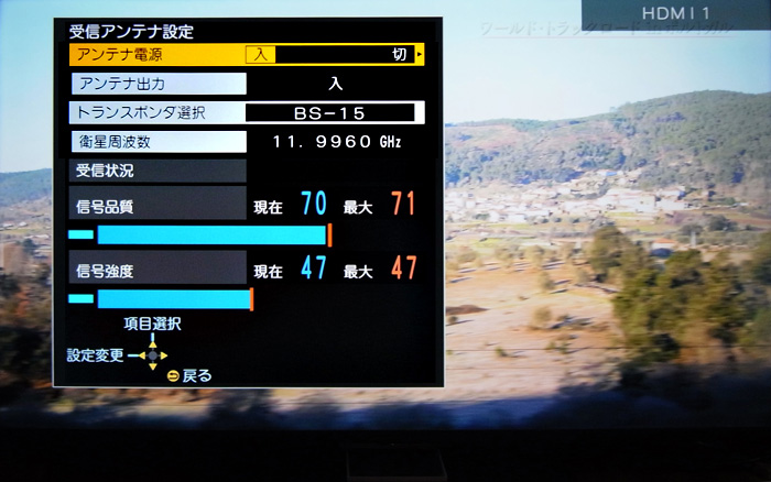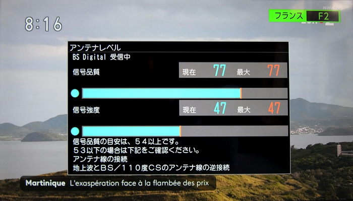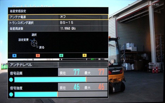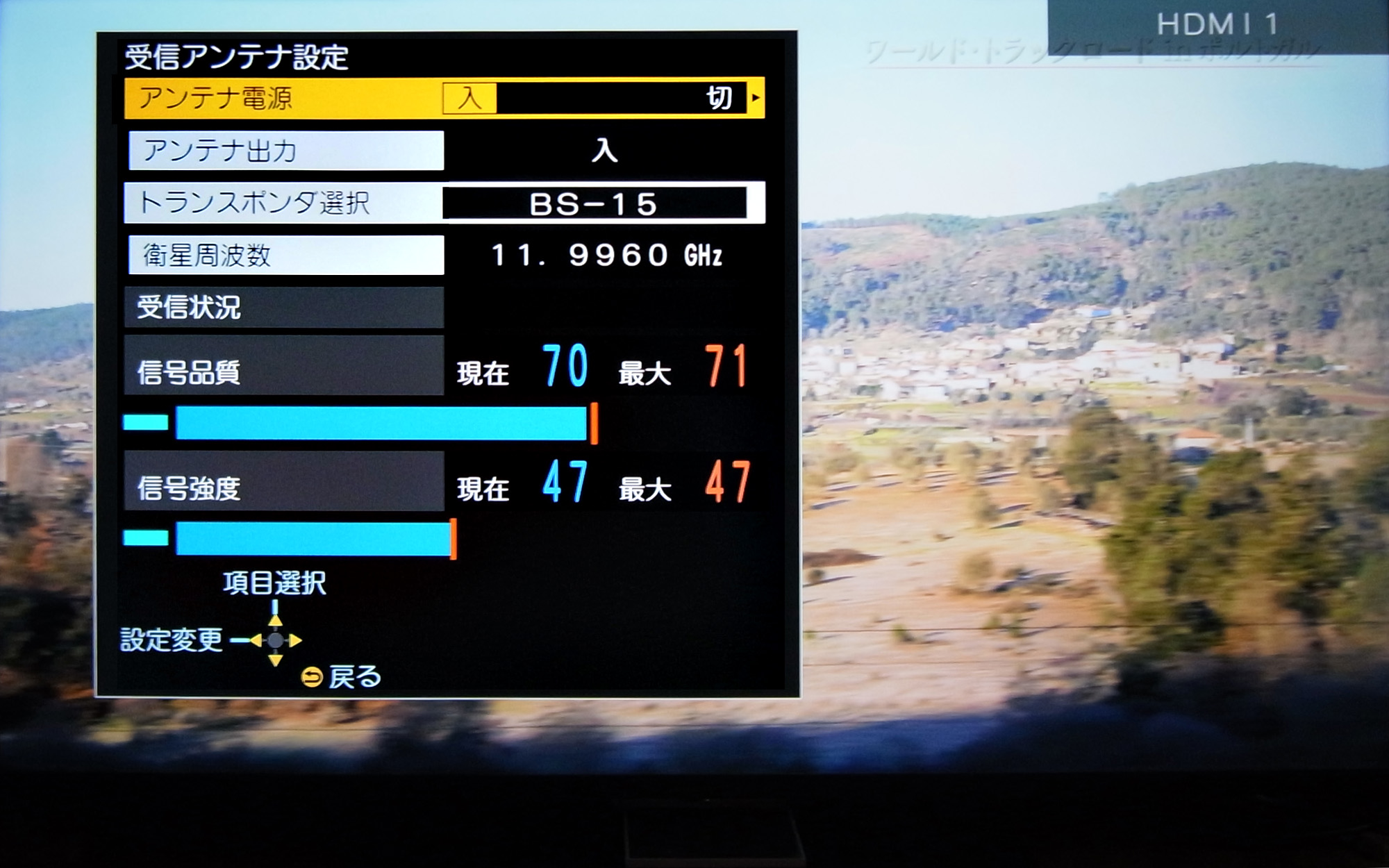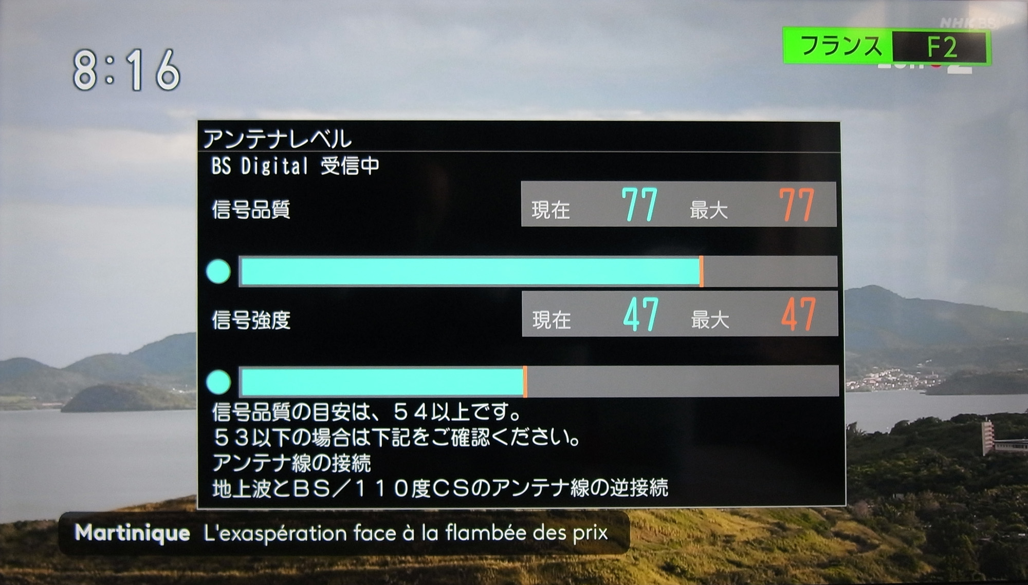 9月13日 しかしこの日は,14時過ぎから映らなくなって夜まで続いた。 よって,「日中の現象」ということではなくなった。 9月19日 (木) (但し,このような時間帯のブラックアウトは前にもあって,それに気づかなかっただけかも知れない。) 9月24日 (木) このままいってしまうのかと危ぶんだが,17時に回復し,そしてつぎの日曜日は1日中だいじょうぶ。 10月1日 (火) これを機に,TV の BSケーブルの接続と,アンテナ電源設定を変更 ( 「テストの計画・実行」)。