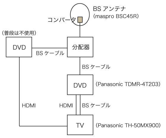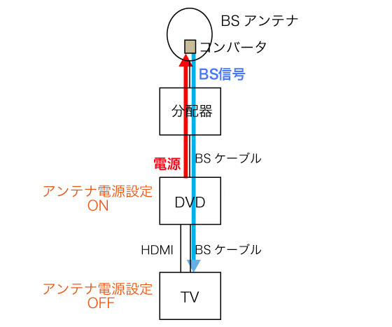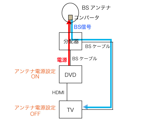 ちなみに,分配器から TV に BSケーブルを直接つなぐときも,TV の「アンテナ電源」設定は「オフ」。 DVD 本体電源のオフ・オンにかかわらず,DVD からアンテナ電源が供給されているからである。 |