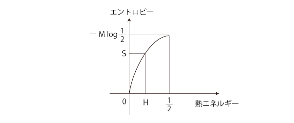 = log (N! × N! /((Nーn)! × (Nーn)! × n! × n!)) = 2 log N! ー2 log(Nーn)! ー 2 log n! スターリングの近似公式を適用して = 2 (N logNー N) ー2 ((Nーn) log(Nーn) ー (Nーn)) ー 2(nlog nーn) = 2 (N logNー N ー (Nーn) log(Nーn) + (Nーn) ー nlog n+n) = 2 (N logN ー (Nーn) log(Nーn) ー nlog n ) = 2 ( ーn( log nー log N ) ー (Nーn) ( log(Nーn) ー log N ) = ー2N ( n/N log n/N + (1ーn/N) log (1ーn/N) ) = ーM ( H log H + (1ーH) log(1ーH ) ) 0 ≤ H ≤ 1 ( ⇐ H = n/N ) に留意して,S = ーM ( H log H + (1ーH) log(1ーH ) ) のグラフを描く。 つぎが y=x log x + (1ーx) log (1ーx) のグラフであった ( エントロピー関数):