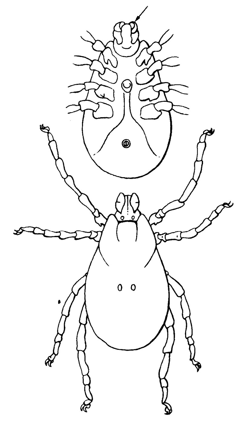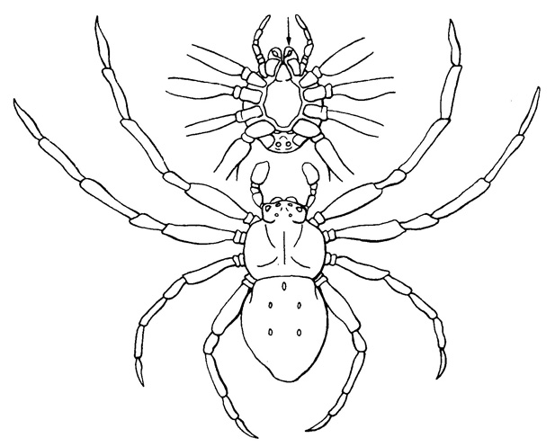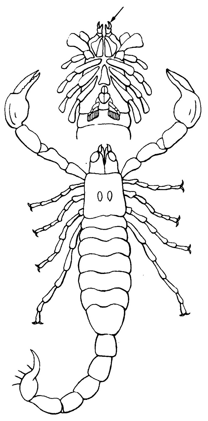 触角も大顎も無く,最前の付属肢は鋏角 (矢印) になっている