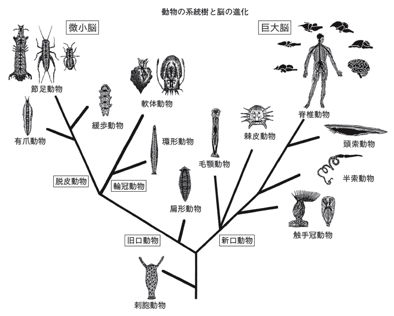 古代の左右相称動物から,棘皮動物や脊椎動物に至る旧口動物の系統と,節足動物,軟体動物などに至る新口動物の系統が分岐