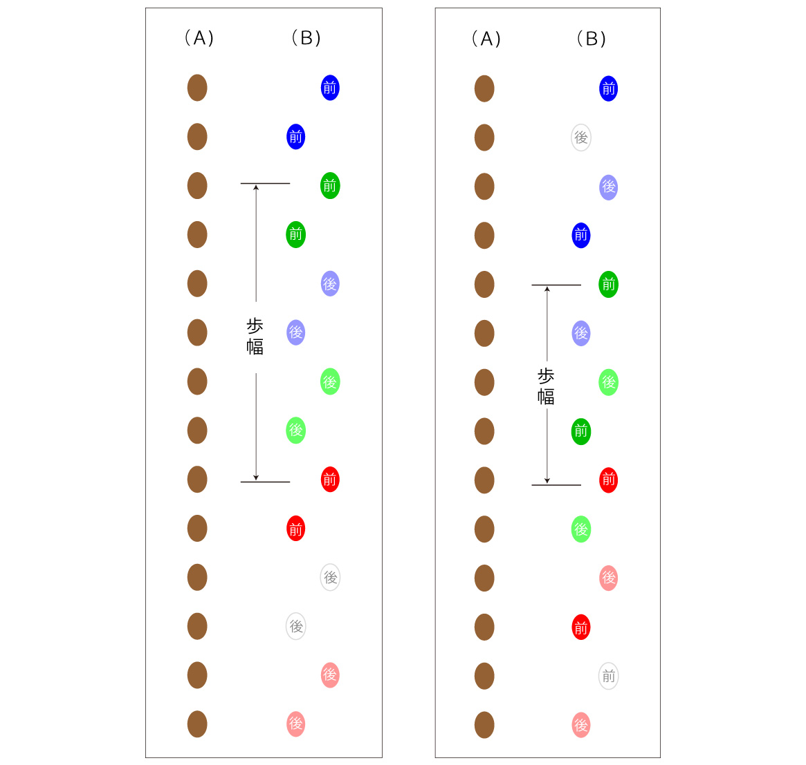 一方,はじめに示した雪の上の足跡は,右・左・右・左となっているように見える。 右・左・右・左になる場合は,つぎの2通りになる: |