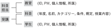 - 「科目は,位置づけは複数であり得るが,物理的存在として一意」をルールとして,科目名をこの一意的存在の ID としてそのまま用いる。