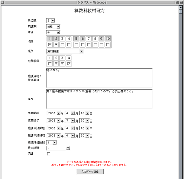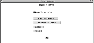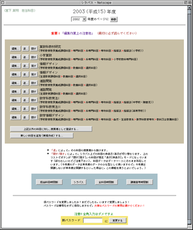 ここで,「シラバス編集作業」の画面 (ユーザ・インタフェース) の実際を紹介する──但し,常勤の授業担当者用。