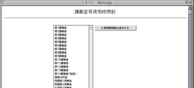 - ここで,施設を選択して表示ボタンをクリックすると,その施設の使用時間割(何期・何曜日・何時限に,何の授業によって使われているか」)が表示される。