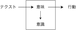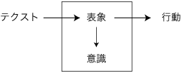 プラトンに発すると見なされているこの伝統は,《対象がその都度異なる相貌で現われるにも拘らず,われわれがそれを同一のものと認めるのは何故であろうか?》という問いに一貫してこだわるものである(註)。 そしてこの伝統は,〈本質〉とか〈真理〉とかを以ってこの問いに答えようとすることにおいて,本質主義,真理主義である。 〈本質〉は色々な言い回しの下で色々に考察されてきた。プラトンは,それを〈イデア〉としてわれわれの〈外〉に理由を求めた。しかし,デカルトのコギト以来,〈本質〉をわれわれの〈内〉によって説明することが趨勢になった。現象学(フッサール)はこの本流の中に位置づく。 テクストに対してこれの意味を見ようとする発想は,この伝統下のものである。テクストは不安を喚起するものであり,テクストを意味に還元することで安心が得られる。しかも,意味に対してテクストはかりそめのものでしかない。したがってこの伝統は,意味中心主義とも呼び得る。 〈意味〉を人の〈内〉に実現するために,"(内的)表象"が発想された。《一つの対象がそれの多様な見かけにも拘らずつねに同一のものと認識されるのは,つねに同一の表象がこれに対応させられるからだ》というのがこの場合の論法になる。また,先の図式が ![]()