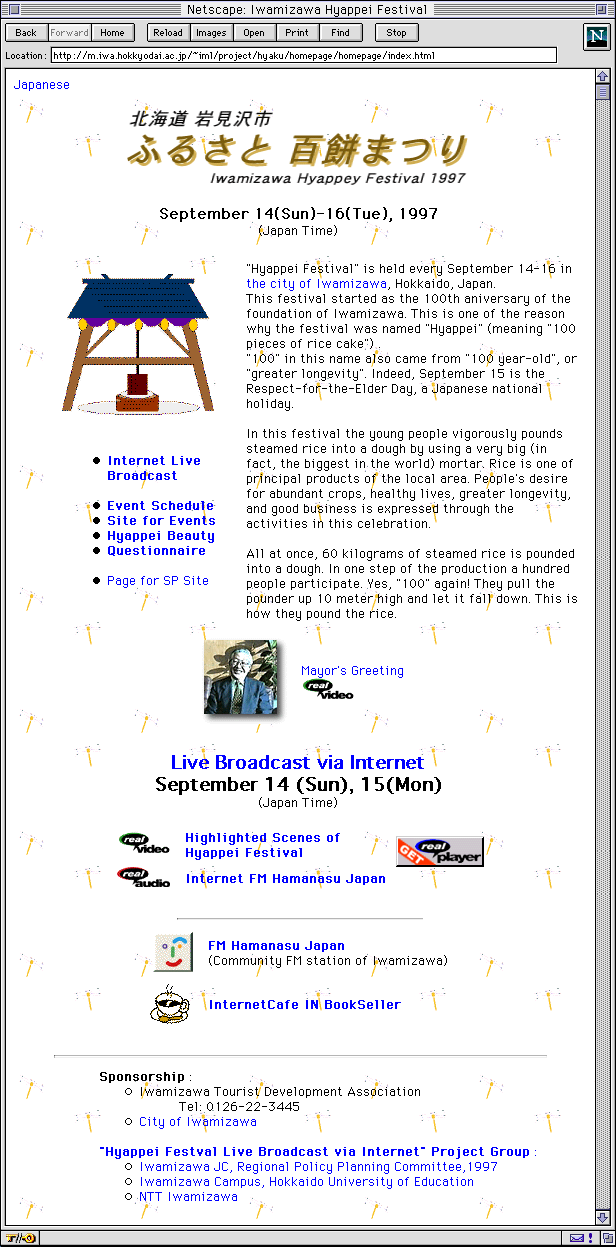 「岩見沢市百餅まつり・インターネット・ライブ放送」はリハーサルを含めて9月14日から16日の3日間行われた。(そのときのホームページは,現在 http://m.iwa.hokkyodai.ac.jp/~iml/project/hyaku/homepage/homepage/ で見ることができる。)ただ放送日時を15日の12字から3時までというようにインターネット上でアナウンスしていたため(Timecast, Internet Watch 等),その時間にアクセスが殺到し,サーバが一時ダウンした。