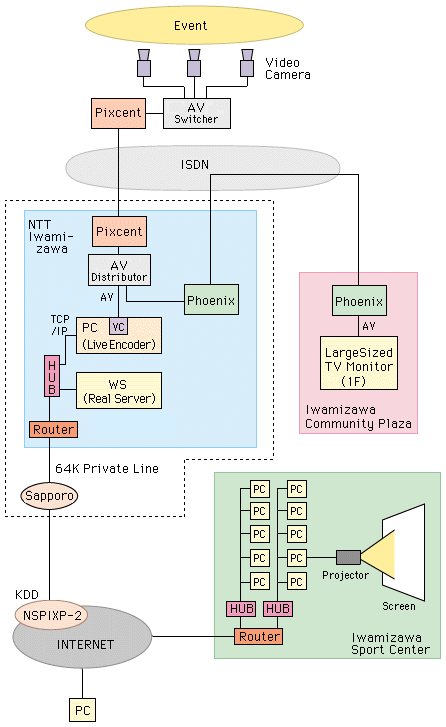 • 現場から放送局へのライブビデオ送信には,TV電話システム Pixend (NTT)を使用する。通信回線は,ISDN 128k。